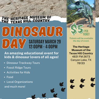 Our biggest event of the year, Dinosaur Day, is coming up on March 29 from 12:00pm-4:00pm. This event includes trackway tours, Fossil Ridge tours, kid-friendly activities, local organizations, food, and more. Thomas Adams, Chief Curator (Paleontology and Geology) at the Witte Museum will be giving hourly talks. We hope to see you there!